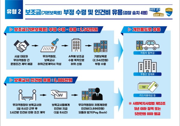 특히 실제 근무하지 않는 허위 종사자에게 인건비를 집행한 후 다시 되돌려 받거나, 노후시설을 개선하는 기능보강사업 보조금을 과다 책정 또는 사업시행업자와 공모해 보조금을 리베이트(rebate) 형태로 돌려받는 행위 등이 집중 수사 대상이다.