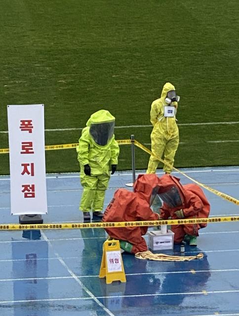 생물테러 의심 사건 발생을 가정해 실제 대응 절차와 동일하게 훈련했다. ▲신고 접수와 상황 전파 ▲초동 조치팀 현장 출동 ▲구조와 구호활동 ▲다중탐지키트 검사 ▲통제선 확대 ▲응급진료소 설치 ▲노출자 이송 및 제독 등으로 이뤄졌다.