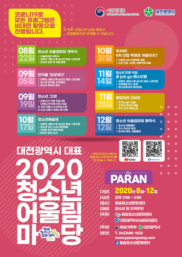 대전시시설관리공단(이사장 설동승)은 오는 22일 오후 3시 평송청소년문화센터에서 대전을 대표하는 청소년 행사인 ‘2020년 청소년 어울림마당’개막식을 온라인으로 개최한다고 20일 밝혔다.