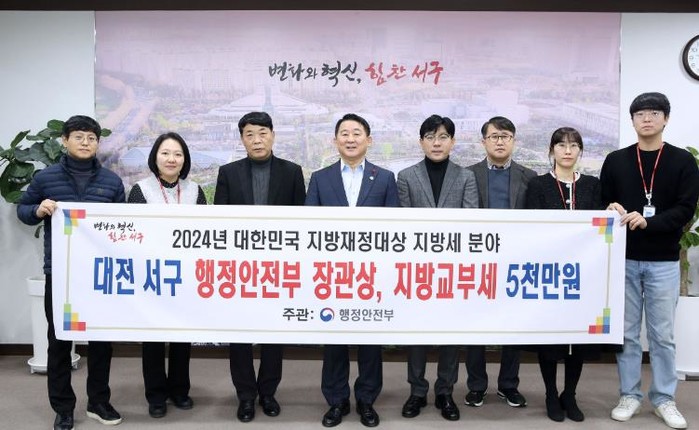 대전 서구는 2024년도 제17회 대한민국 지방재정대상 지방세 세입증대 분야에서 행정안전부 장관상을 수상하고 재정인센티브로 지방교부세 5천만 원을 확보했다고 8일 밝혔다.
