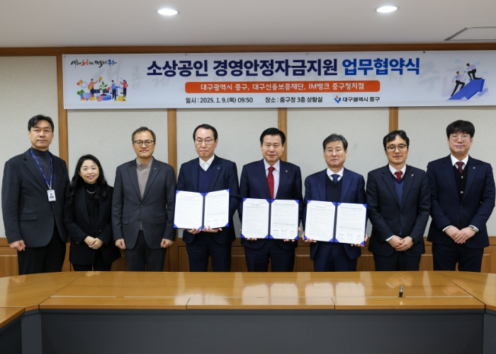 대구 중구는 지난 9일 구청 소회의실에서 대구신용보증재단, IM뱅크 중구청지점과 고금리 장기화와 내수 회복 지연으로 어려움을 겪고 있는 소상공인들의 자금난 해소와 이자 부담 완화를 위한 경영안정자금 지원 협약을 3년 연속으로 체결했다.