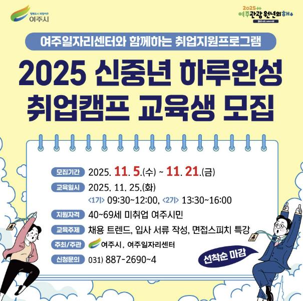 여주시는 오는 11월 25일 여주일자리센터에서 관내 40세부터 69세 미취업자 20명을 대상으로 ‘2025 신중년 하루 완성 취업캠프’를 운영한다.