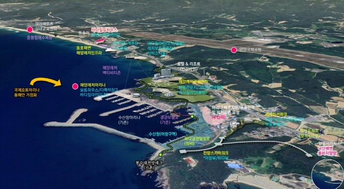 이번 사업은 총 1조 300억원 규모로 추진되며, 재정사업 2,000억원과 민간투자 8,300억원으로 구성됐다. 사업 부지는 손양면 수산리 9-3 일원으로, 수산항을 중심으로 총 235만㎡(해역 165만㎡, 육역 70만㎡)에 달한다. 사업 기간은 2026년부터 2035년까지 10년간이다.