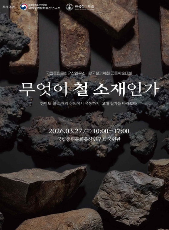 국가유산청 국립문화유산연구원 국립중원문화유산연구소는 한국철기학회와 함께 2026년 3월 27일 오전 10시 국립중원문화유산연구소 국원관에서『무엇이 철 소재인가?』를 주제로 공동 학술대회를 개최한다.
