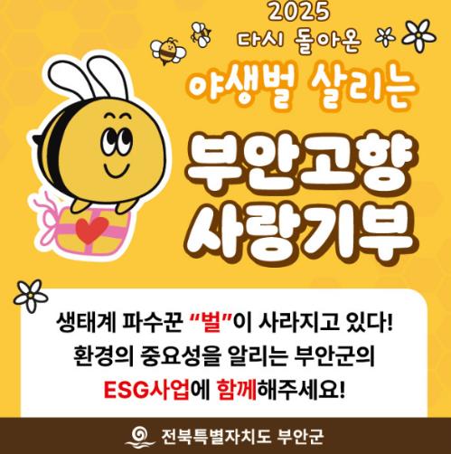 ‘야생벌 붕붕이를 지켜주세요!’ 사업은 부안군 제1호이자 전북특별자치도 지자체 중 처음 시작한 지정기부 사업으로 생태계 유지의 핵심 역할을 하는 야생벌의 서식지를 보존하고 생물 다양성을 증진시키기 위해 추진된 지정기부 프로젝트다.