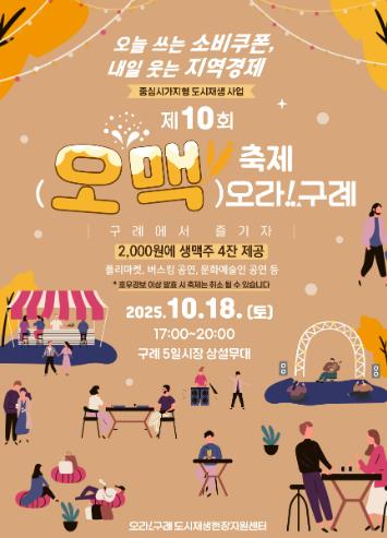 전남 구례군은 오는 10월 18일 오후 5시부터 8시까지 구례읍 5일시장 상설무대 일원에서 '제10회 오맥축제 오라! 구례, 구례에서 즐기자'를 개최한다고 밝혔다.