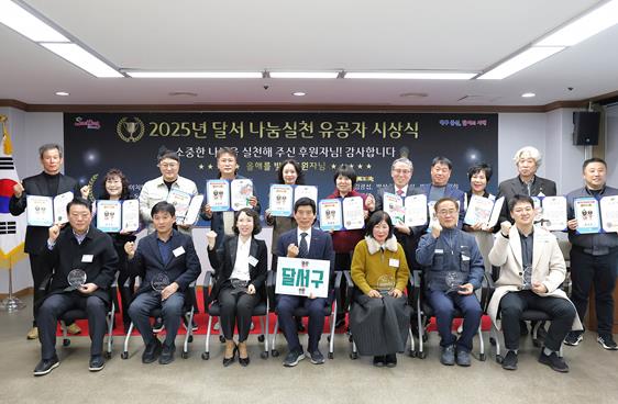 대구 달서구는 지난 26일 달서구청에서 지역의 어려운 이웃을 위해 꾸준한 나눔을 실천해 온 기업·단체 및 개인 유공자들에게 감사의 뜻을 전하는 ‘2025년 나눔실천 유공자 시상식’을 개최했다.