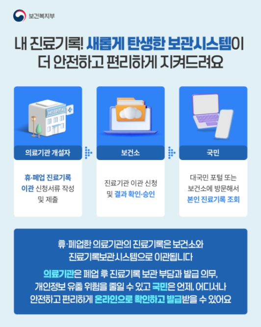 보건복지부와 한국보건의료정보원은 다니던 병원이 문을 닫아도 국민이 자신의 진료기록을 보다 편하게 확인할 수 있도록 휴·폐업 의료기관 진료기록보관시스템 개선을 추진한다고 밝혔다.
