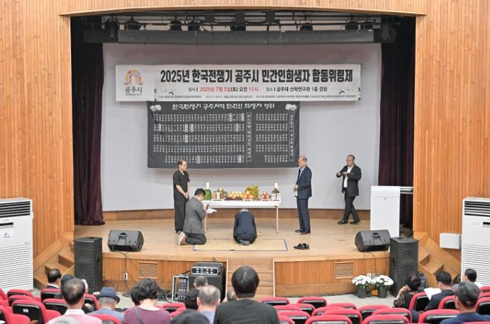 공주시의회 임달희 의장이 5일 오전 공주대학교 산학연구관에서 열린 2025년 한국전쟁기 공주시 민간인희생자 합동위령제에 참석하여 전쟁으로 희생된 민간인들의 넋을 기리며 애도의 뜻을 전했다.