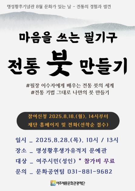 여주세종문화관광재단은 오는 8월 28일, 명성황후기념관 8월 문화가 있는 날프로그램으로‘마음으로 쓰는 필기구, 전통 붓 만들기’를 진행한다.
