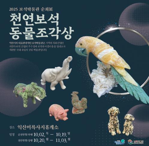 익산시 보석박물관은 추석 연휴가 시작되는 10월 2일부터 11월 3일까지 익산미륵사지휴게소(양방향)에서 '천연보석 동물조각상' 순회전시를 진행한다.
