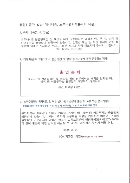 이에 노사협력과 담당자는 “여름·겨울방학 조정으로 수업일수를 확보할 것이기에 방학중비근무자는 3월 근무일이 여름·겨울방학으로 변경되어 임금총액에는 변화가 없을 것”이라고 밝혔다. 또한 “17개 시·도교육청은 근로자의 의견을 들어 맞춤형복지비, 정기상여금, 연차수당을 미리 지급하거나, 임금 선지급안을 마련하여 시행할 것”이라고 덧붙였다.