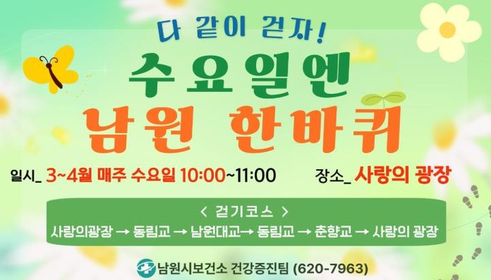 남원시보건소가 시민의 건강 증진과 일상 속 운동 습관 형성을 위해 오는 4월부터 11월까지 걷기 실천 프로그램인 ‘수요일엔 남원 한바퀴’를 운영한다.