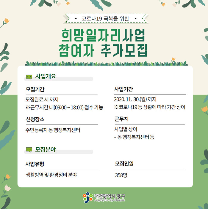 대전 중구(구청장 박용갑)는 5일 코로나19 경제위기 극복을 위한 희망일자리사업 중 생활방역 및 환경정비 분야에 358명을 추가 모집한다고 밝혔다.
