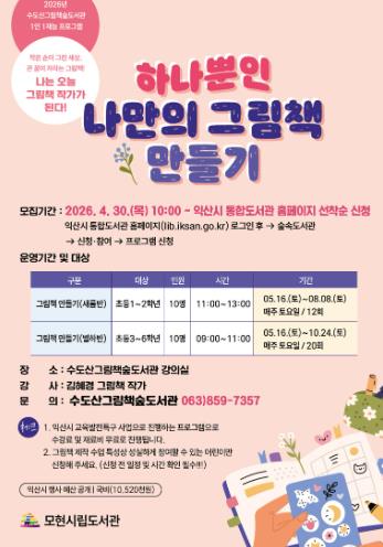 익산시 수도산그림책숲도서관은 오는 5월 16일부터 초등학생을 대상으로 '하나뿐인 나만의 그림책 만들기' 수업을 운영한다.