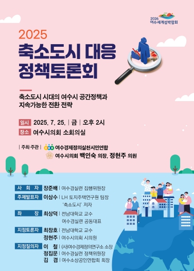 여수시의회는 오는 25일 시의회 소회의실에서 ‘축소도시 시대의 여수시 공간정책과 지속가능한 전환 전략’을 주제로 정책토론회를 개최할 예정이다.