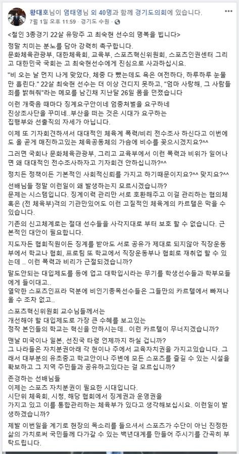 경기도의회 교육행정위원회 황대호 의원(더불어민주당, 수원4)이 철인 3종경기 종목 故 최숙현 선수의 안타까운 사망에 대해 분노하며 개인 SNS(페이스북)을 통해 게시한 글이 많은 국민들의 공감과 지지를 받고 있다.