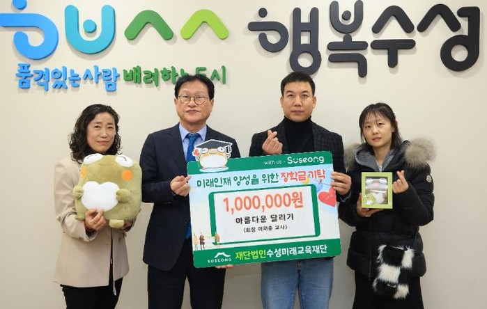 아름다운 달리기 모임은 지난 24일 미래인재 육성과 지역 교육발전을 위한 장학금 1백만원을 수성미래교육재단에 기탁했다.