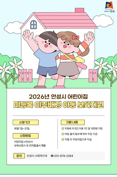 안성시는 2026년부터 어린이집에 다니는 미등록 외국인(이주배경) 영유아에게 월 10만원의 보육지원금을 지원한다고 밝혔다.