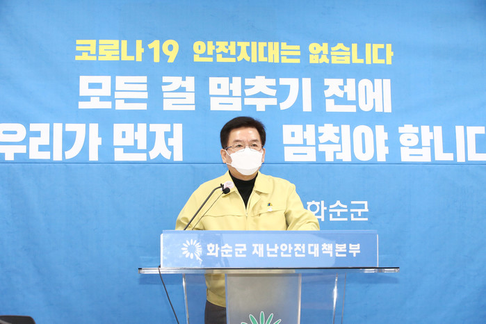 구충곤 화순군수는 발표문을 통해 “타지역 확진자 가족과 접촉을 통해 시작된 감염이 순식간에 요양병원에서 집단·연쇄감염으로 번졌다”며 “연말연시 타지역 방문을 자제해주시고, 특히 가족·지인과의 송년 모임 등은 모두 취소해주시기 바란다”고 당부했다.