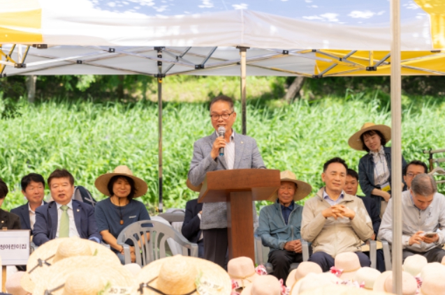 ▲ 4일 양재천 벼농사 학습장에서 열린 “양재천 전통 모내기 행사”에서 복진경 부의장이 축사를 하고 있다. |