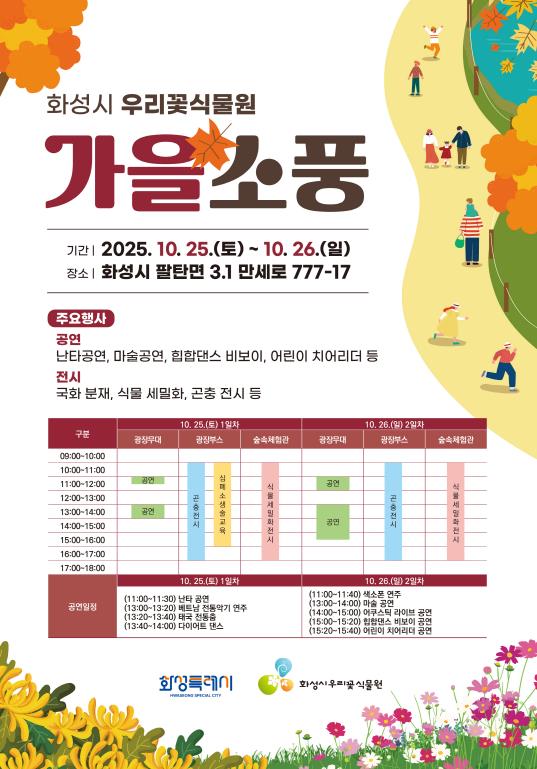 오는 25일부터 26일까지 화성특례시 우리꽃식물원에서 깊어가는 가을의 정취를 느낄 수 있는 ‘2025 우리꽃식물원 가을소풍’ 행사가 펼쳐진다.