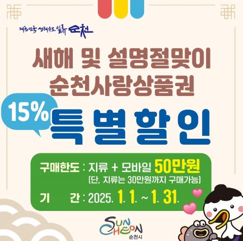 순천시는 새해를 맞아 침체된 지역경제에 활력을 불어넣을 마중물로 순천사랑상품권 15% 할인판매를 시작했다.
