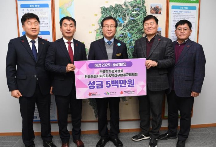 한국전기공사협회 전북특별자치도회와 덕진완주협의회가 완주군에 성금 500만 원을 전달하며 ‘희망 2025 나눔캠페인’에 동참했다.