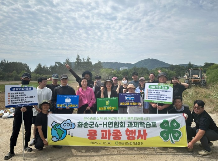 화순군4-H연합회가 지난 12일 화순군 도곡면에 있는 공동과제학습포에서 콩 파종 작업을 진행했다.
