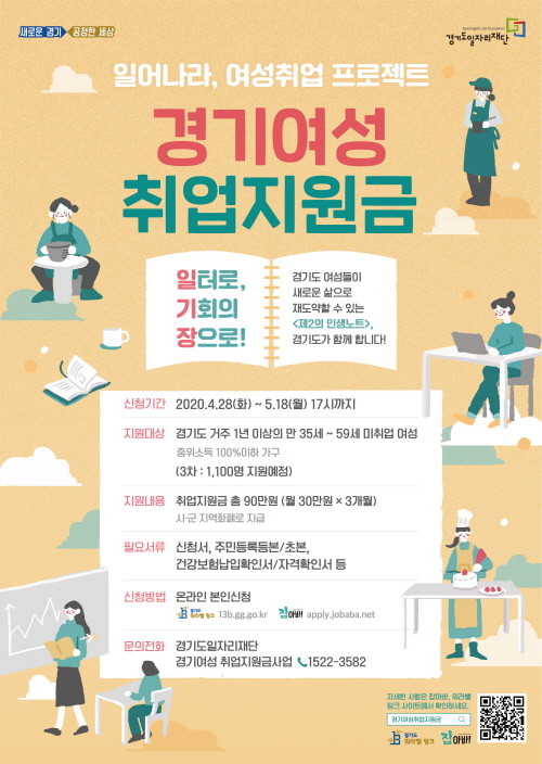 지원 대상은 적극적 구직의사가 있는 만 35~59세 여성으로, 중위소득100% 이하 가구 중 경기도 거주 1년 이상의 미취업자이며, 선정 인원은 1,100명 내외이다.