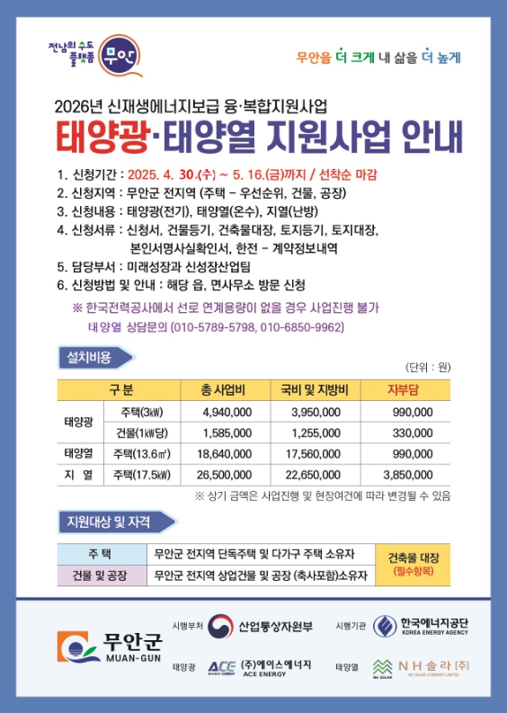 전남 무안군은 신재생에너지 보급 확대를 위한 ‘2025년 신재생에너지 융복합 지원사업’을 본격 추진한다.