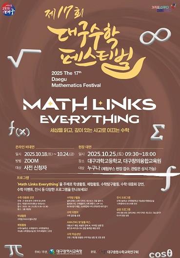 대구시교육청이 주최하고 대구중등수학교육연구회가 운영하는 ‘제17회 대구수학페스티벌’이 10월 25일 9시 30분부터 대구과학고 및 대구창의융합교육원에서 'Math Links Everything(수학은 모든 것을 연결한다)'이라는 주제로 개최된다.
