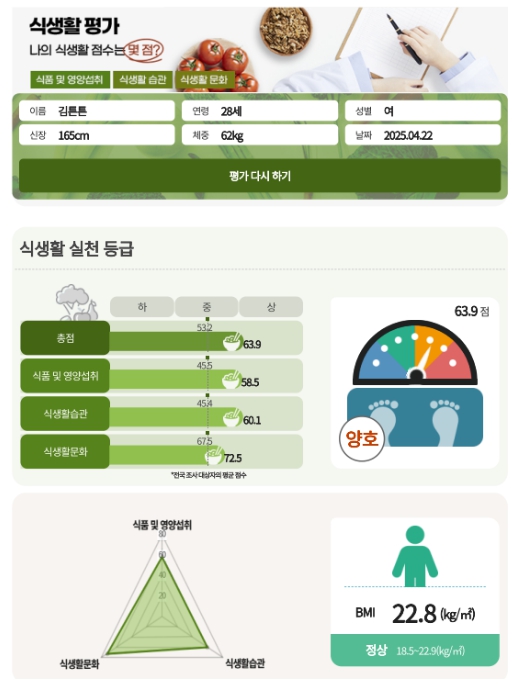 개인이 생애주기에 맞는 식생활 실천 점검표를 보고 해당 칸에 표시하면 식생활을 잘 실천하고 있는지가 등급(상, 중, 하)과 점수(100점 만점)로 나타난다. 전국 평균 점수도 함께 보여줘 본인의 식생활 상태를 한눈에 파악할 수 있다.