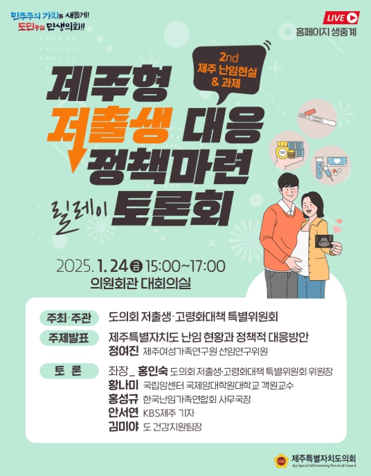 제주특별자치도의회 저출생‧고령화대책 특별위원회는 24일 도의회 대회의실에서 정책토론회를 개최한다.