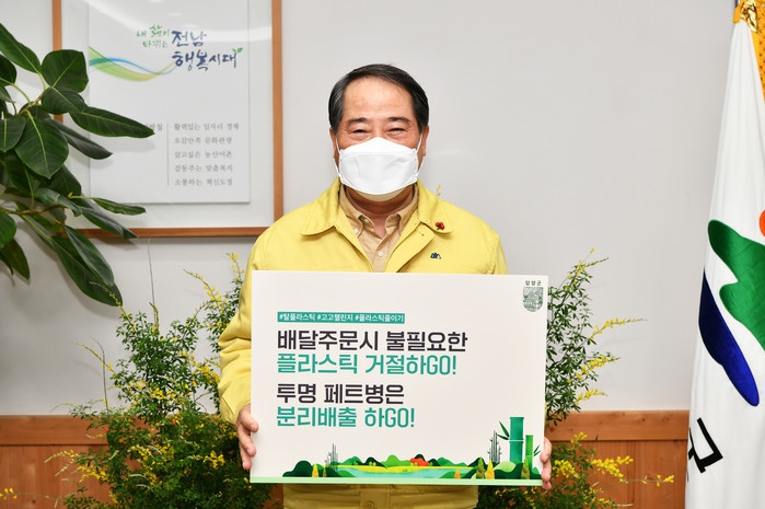 [전남=프레스뉴스] 박정철 기자= 최형식 담양군수가 4일 탈 플라스틱 실천 운동인 고고 챌린지에 동참해 배달주문 시 불필요한 플라스틱은 거절하고 투명 페트병은 분리배출하자고 제안했다.