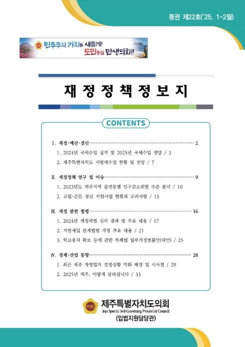 제주특별자치도의회는 2월 28일, 지방재정 분야의 전문성을 강화하기 위해 최근 재정연구 동향과 재정정책 이슈, 재정 관련 법령의 제·개정 사항, 경제·산업 동향 등을 종합적으로 수록한 '재정정책정보지' 통권 제22호(2025년 1~2월)를 발간했다.
