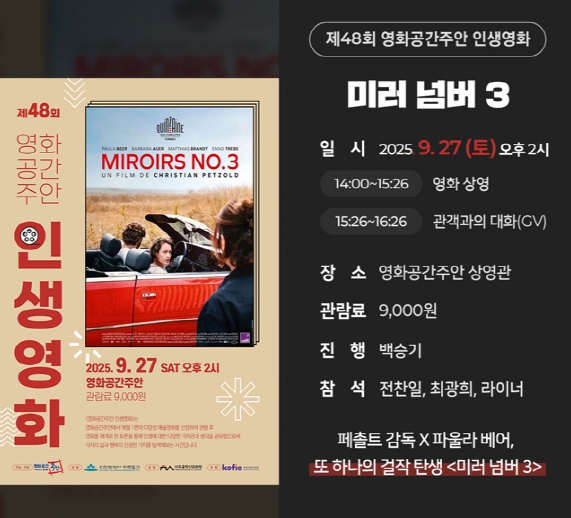 이번 상영작은 올해 칸국제영화제 감독 주간 초청작 ‘미러 넘버 3’로, 영화공간주안 4관에서 상영된다.