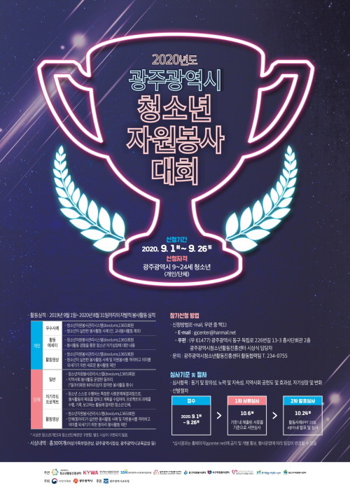 광주광역시는 우수 청소년 자원봉사자를 발굴하고 포상하기 위한 ‘2020년도 광주광역시청소년자원봉사대회’를 개최한다.