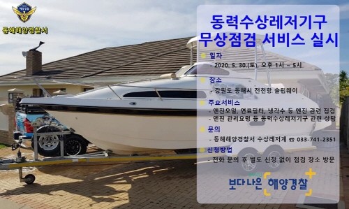 무상점검을 받고자하는 동력수상레저기구 보유자 및 활동자는 별도의 신청 없이 오는 30일(토) 오후 1시부터 5시까지 동해시 전천항 슬립웨이로 방문하면 누구든지 무상점검을 받을 수 있다.