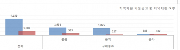 이 중 26.1%인 1082건을 지역제한으로 입찰진행했으며, 물품 27%와 용역 12.4%, 공사 86.6%를 지역제한으로 입찰한 것으로 조사됐다.