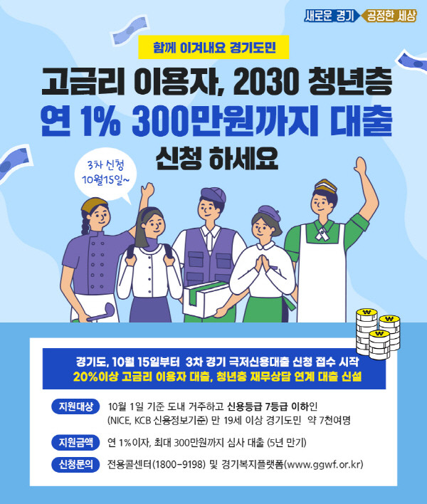 3차 ‘경기 극저신용대출’ 지원대상은 기존과 같이 10월 1일부터 신청일 현재 경기도에 거주하고, 신용등급(NICE, KCB 기준) 7등급 이하인 만 19세 이상의 도민이다. 신용등급과 경기도 거주 요건만 충족하면 연 1% 이자, 심사를 거쳐 300만원까지 대출 가능하다.