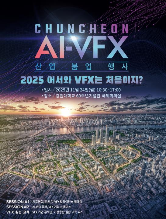 춘천시는 2025년 11월 24일 강원대학교 60주년 기념관 국제 회의실에서 ‘춘천 AI-VFX 산업붐업행사 – 2025 어서와! VFX는 처음이지?’를 개최한다고 밝혔다.