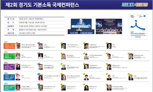 경기도는 9월11일 비대면 온라인(basicincomfair.gg.go.kr) 방식으로 경기연구원과 함께 ‘제2회 경기도 기본소득 국제 컨퍼런스’를 ‘2020 대한민국 기본소득 박람회’ 2일차에 개최한다고 밝혔다.