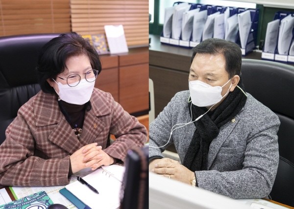 ▲ 안산시의회 박은경 의장(사진 左)과 이기환 문화복지위원장이 11일 오후 각각 의장실과 문화복지 위원장실에서 의회가 최근 구축한 화상회의 장비를 통해 안산시의 ‘2021년 주민과의 대화’에 참여했다. |