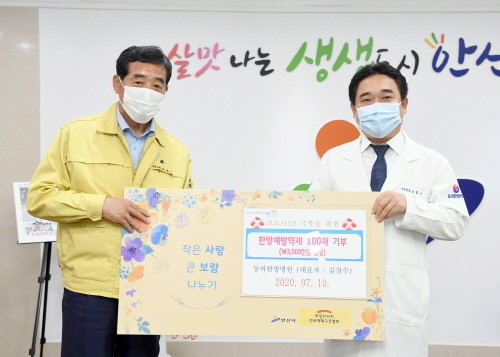 안산시(시장 윤화섭)는 동의한방병원으로부터 코로나바이러스감염증-19(코로나19) 확산 방지와 어르신들의 건강 증진을 위해 사용해 달라며 청폐배독탕 50재와 옥병풍산 50재 등 한방예방약제 100재(3천만 원 상당)를 기탁 받았다고 13일 밝혔다.