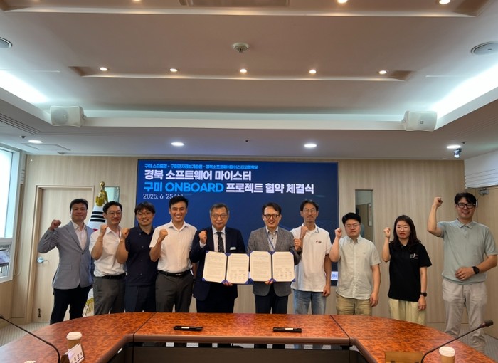 구미 ONBOARD 프로젝트의 출발점으로, 6월 25일(수) 구미전자정보기술원 진흥관(본관) 3층 대회의실에서 청년(고졸) SW 인재의 구미 유입과 지역 정착, 그리고 스타트업 인력난 해소를 위한 '경북 소프트웨어 마이스터 ONBOARD 프로젝트' 협약식이 진행됐다.