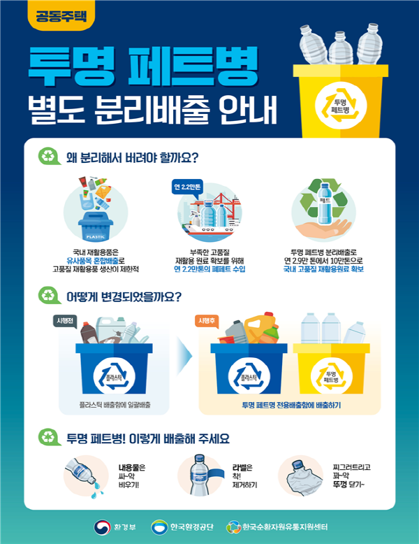 이에 따라 공동주택 관리사무소에서는 기존 플라스틱 배출함과 구분되는 별도 투명 페트병 전용 배출함을 마련해야 한다. 분리 배출된 투명 페트병은 재활용 업체에서 선별과 재생원료 처리 과정을 거쳐 기능성 의류, 가방 등에 쓰이는 의류용 원사로 만들어지거나 재생 용기로 재생산된다.