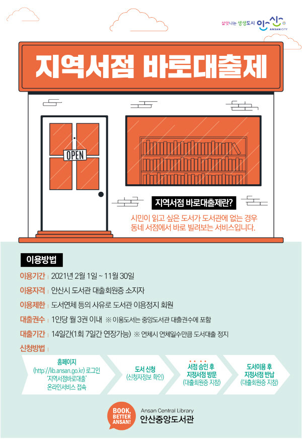 안산시 도서관 회원 등록자 누구나 중앙도서관 홈페이지에 접속해 ‘지역서점 바로대출’ 온라인 서비스를 통해 신청해 이용하면 된다.