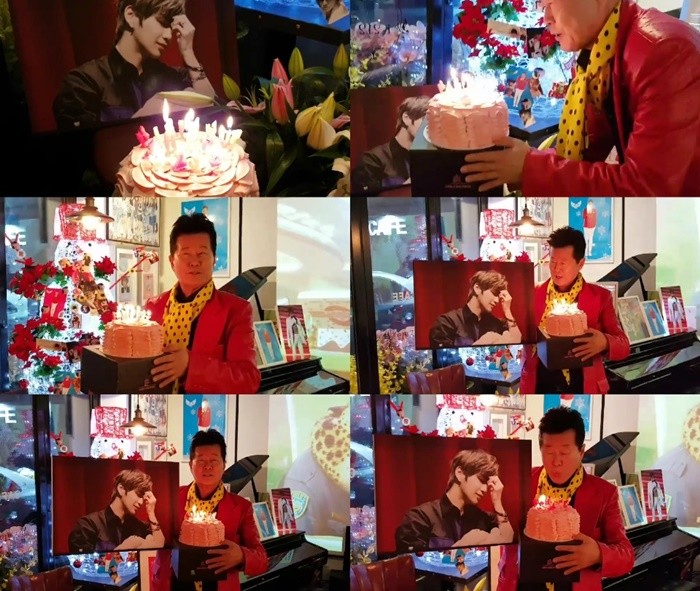 영상 속 태진아는 한 손에는 워너원 강다니엘의 사진을, 또 다른 손에는 케이크를 들고 생일 축하곡 'Happy birthday to you'를 열창하고 있다.