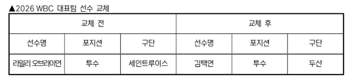 KBO 전력강화위원회는 부상으로 인해 WBC 참가가 어려워진 세인트루이스 라일리 오브라이언을 대체할 선수로 두산 김택연을 확정하고 WBC 조직위에 선수 교체 승인을 요청했다.